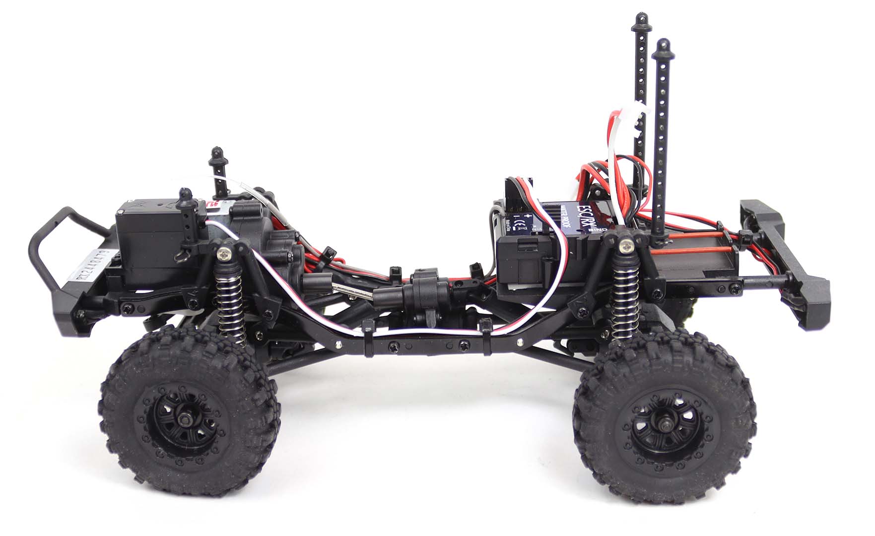 .Chassiset er lavet af aluminiumslegering og plast, hvilket gør det både let og holdbart. Affjedringen har fire uafhængigt monterede støddæmpere, der giver fremragende greb og stabilitet på alle overflader. Bilen har også en god vægtfordeling, hvor motor og servo er monteret foran, og kontrolelementer og batteri er monteret bagpå, hvilket er perfekt til det mest udfordrende crawler-terræn. Derudover er der et virkelig flot og detaljeret karosseri på bilen, med præinstallerede (LED) forlygter foran og lys bagpå, hvis du drejer, blinker det i den retning, du tager rattet, et utroligt frækt karosseri ganske enkelt!